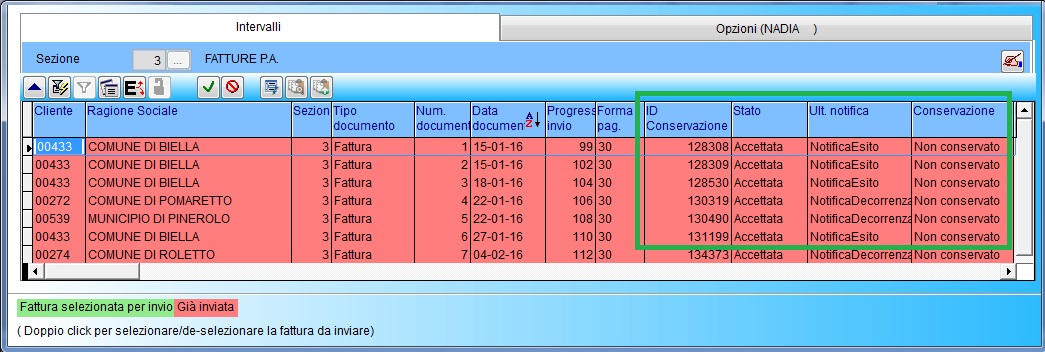 Comparirà l'elenco delle FatturePA, con evidenziate in verde le fatture da inviare e in