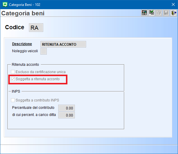 ▪deve essere caricata una Categoria Bene (C – 1.B) di tipo Rit.Acconto = S