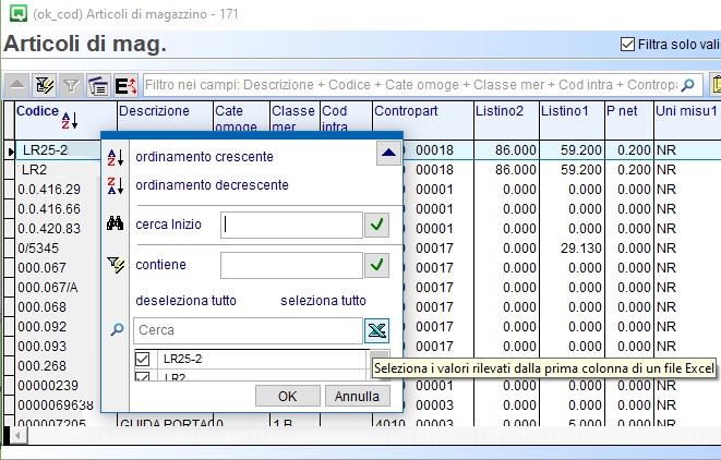 ▪entrare in gestione articoli e posizionarsi sulla colonna “Codice” per attivare “Ricerca e Filtri”. Cliccare su “Seleziona i valori rilevati dalla prima colonna di un file Excel” per selezionare il percorso e prelevare il file,