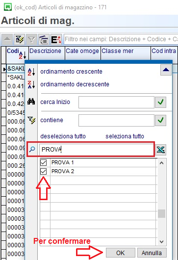Implementata la creazione dei filtri. Facendo click destro sulla colonna di una griglia e andando in ricerca/filtri è disponibile una nuova riga (vicino alla X di Excel) che eseguirà la ricerca in modalità Excel. Se si fa, per esempio, dall'ok cod articoli nella colonna del codice articolo scrivendo nel nuovo campo visualizzato "PROVA" saranno filtrati tutti gli articoli che contengono PROVA all'interno del codice, con la possibilità di selezionare/deselezionare l'elenco dei risultati per affinare il filtro desiderato.