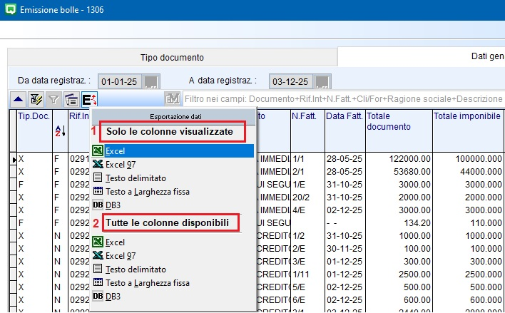 Implementata la procedura di esportazione delle griglie in Excel. Ora sarà possibile scegliere se esportare tutte le colonne previste nella griglia oppure solo le colonne visualizzate nella stessa.