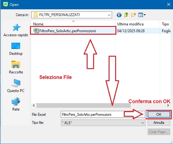 ▪ dopo aver confermato l’ importazione il tasto funzione eXcel sarà evidenziato, confermare su OK per filtrare gli articoli,