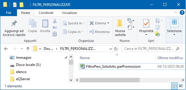 Cliccando invece sul bottone di Excel sarà possibile importare una ricerca pre impostata da un file di Excel. (Tutto eQuilibra) Es. è stato girato un file di Excel, dall’ufficio commerciale, di articoli destinati ad una promozione che non hanno la stessa classe merceologica e/o categoria omogenea, per visualizzarli velocemente: ▪Salvare il file,