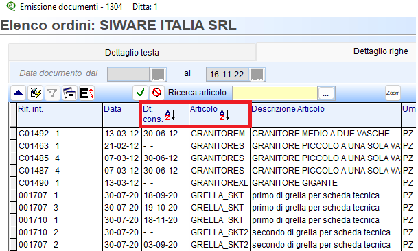 creata la possibilità di ordinare su più colonne. Come da esempio sotto riportato l’ ordinamento è stato eseguito per articolo+data consegna: