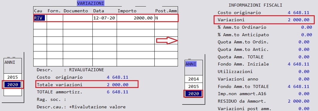 N.B.: Quando si è posizionati su una delle tre maschere a disposizione (variazioni, civilistica e fiscale), muovendosi con le frecce sugli esercizi, si otterrà la visualizzazione della maschera relativamente all'esercizio su cui si è posizionati.