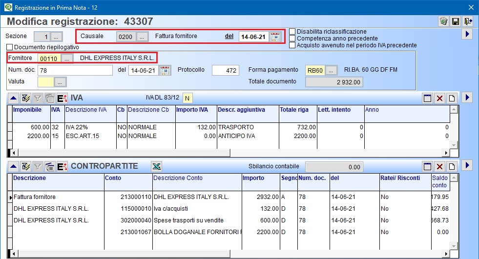 Al termine delle tre registrazioni il saldo del fornitore Bolla Doganale Paesi ExtraCee deve risultare a zero.