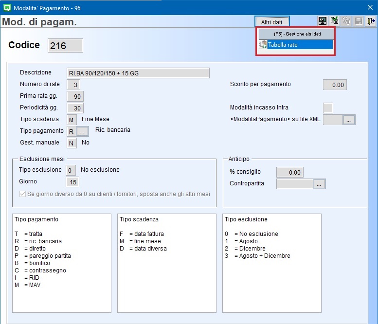 Dopo aver compilato i dati confermare l'inserimento/modifica della forma di pagamento con F10