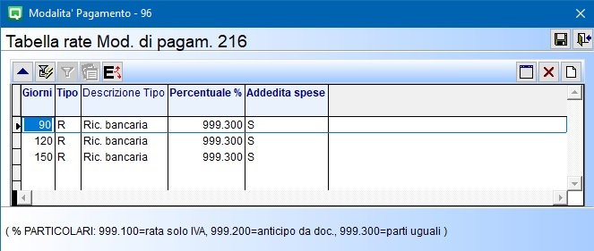 La tabella è formata da diverse colonne. La prima identifica i giorni che intercorrono tra una scadenza e l’altra, la seconda individua il tipo di pagamento, la terza è la percentuale delle vaie rate (vedi legenda), nel nostro esempio 999.300 = rate in parti uguali, la quarta invece specifica se addebitare o meno le spese d’incasso.