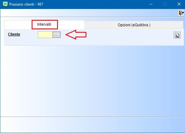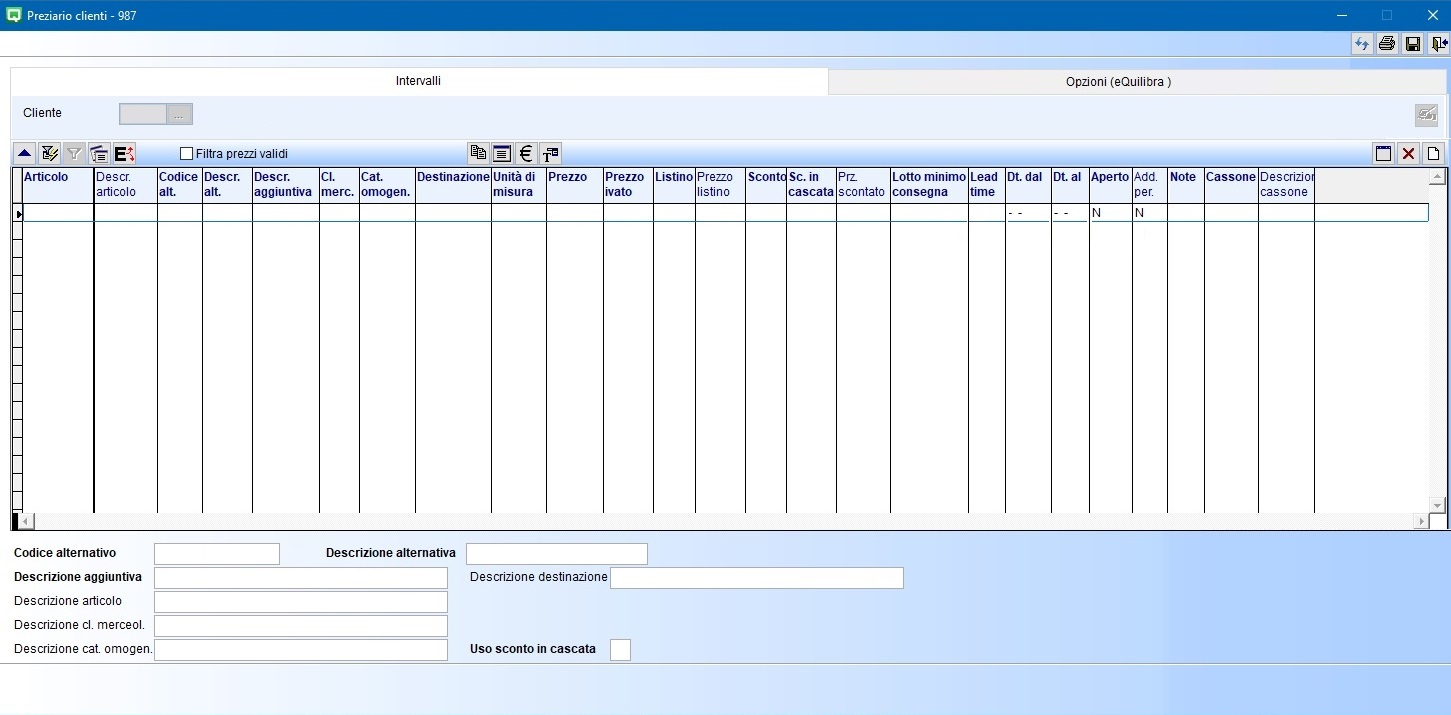 In Intervalli è possibile inserire/modificare/visualizzare il preziario; per attivare il preziario su ogni singolo cliente eseguire la ricerca e selezionare un codice, lasciando il campo vuoto sarà attivato su tutti i clienti.