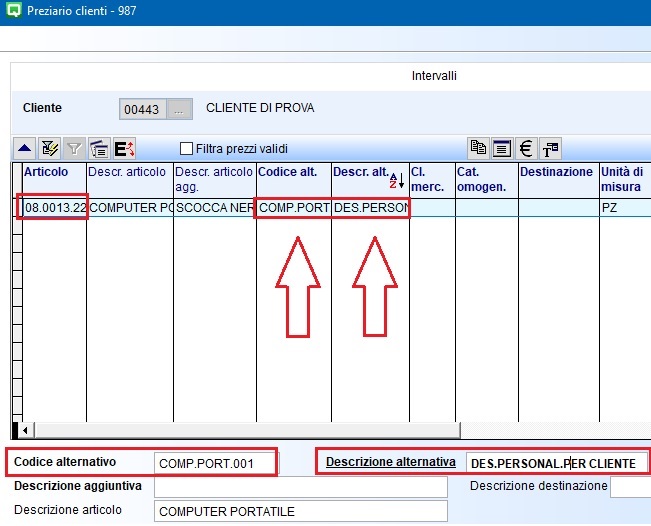 ▪Nasc.descrizioni: la colonna è sottovariabile; se attiva, è possibile definire, su ogni singola riga del preziario, se mantenere la descrizione dell’articolo quando sul preziario sono presenti il codice alternativo e la descrizione alternativa.