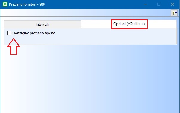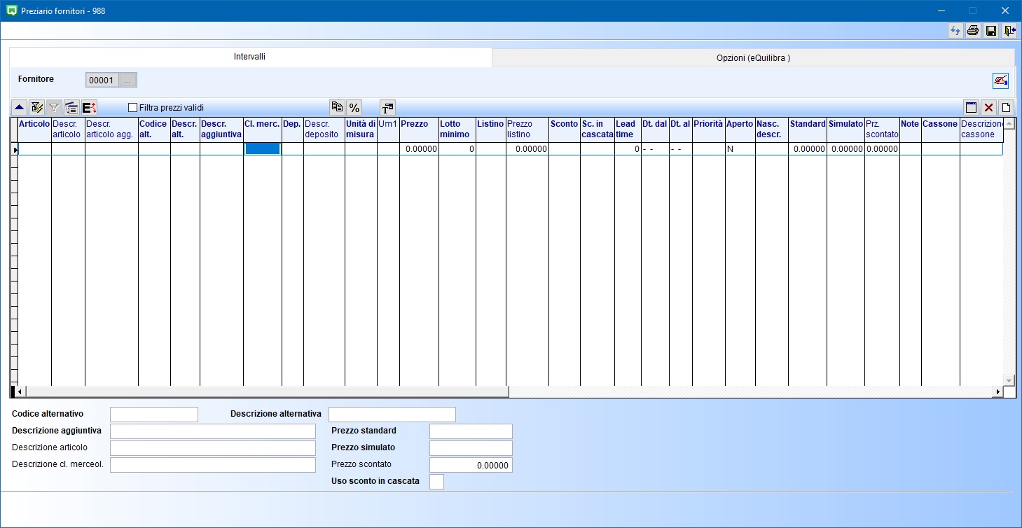 Il Preziario Fornitori si presenta suddiviso in due sezioni Intervalli, Opzioni.