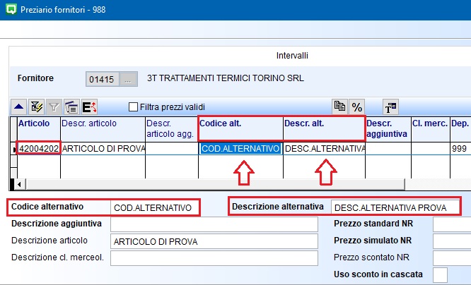 In Intervalli è possibile inserire/modificare/visualizzare il preziario; per attivare il preziario su ogni singolo fornitore eseguire la ricerca e selezionare un codice. Attenzione! non è possibile lasciare il campo vuoto.