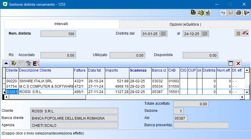 è l'utilizzo del portafoglio SBF concesso dalla Banca, viene aggiornato dopo la contabilizzazione delle distinte utilizzando il programma Importazione Effetti (C 5-1-2). Il valore finale è dato dall'importo Accordato - (la somma delle singole distinte contabilizzate).