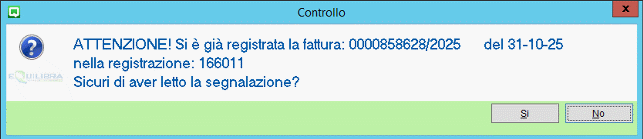 Dal 13 novembre le fatture non recapitate il 4 e 5 novembre potrebbero essere rese disponibili e scaricate con le altre fatture. Se si cercherà di registrarle il programma si accorgerà che sono già registrate e segnalerà un messaggio simile al seguente: