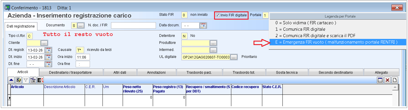Al fine di favorire l’operatività dei nostri Clienti e permettere l’emissione di FIR vidimati ma completamente vuoti dal programma eQrentri, è stata implementata la seguente modifica: