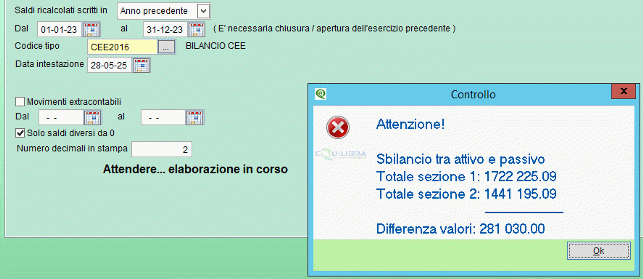 Aggiunto controllo squadratura tra attivo e passivo. Nel caso specifico viene emesso un messaggio che segnala la squadratura. Occorrerà procedere con le Stampe Verifica per risolvere il problema.