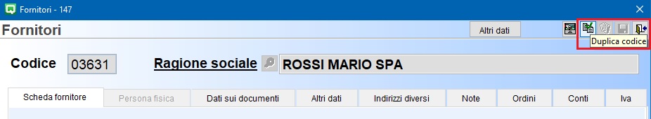 Il fornitore relativo alla fattura va caricato come cliente duplicandolo dall’anagrafica fornitori, utilizzando la funzione dedicata “Duplica Codice”:
