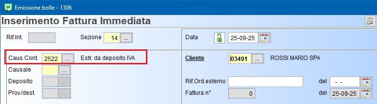 In fase di emissione del documento occorre indicare la “Causale Contabile” codificata come indicato al punto 1) lasciando vuota la causale di magazzino: