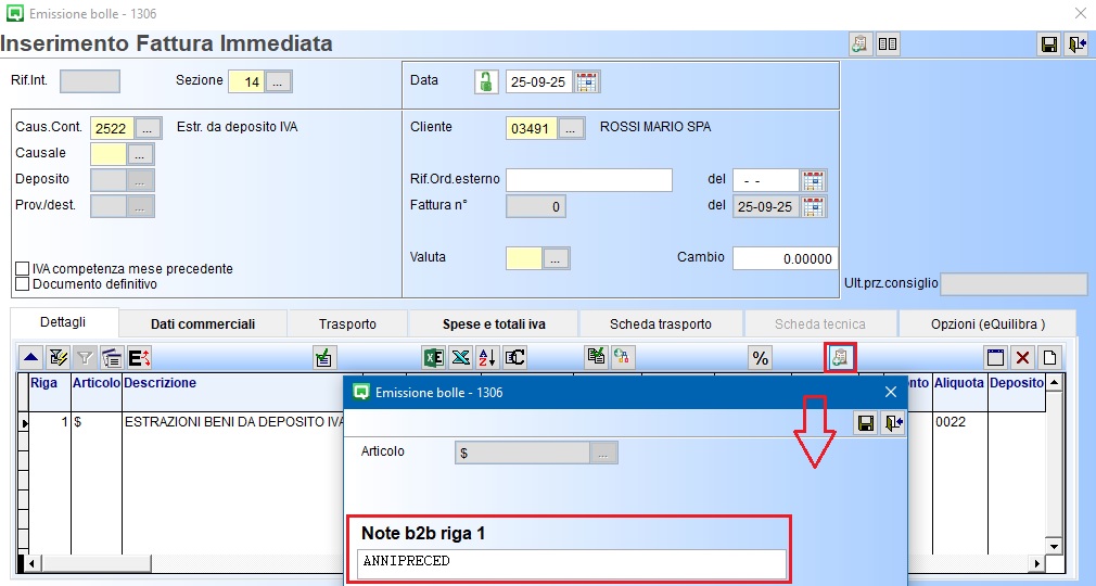 ▪in “Note b2b riga” la dicitura NELLANNO, se l’acquisto è avvenuto nello stesso periodo d’imposta, oppure ANNIPRECED se l’acquisto è avvenuto nel periodo d’imposta precedente. Tale dato sarà riportato nell file XML, come da specifiche dell’Agenzia delle Entrate, nel TAG 2.2.1.16.1<TipoDato> della sezione <AltriDatiGestionali> per specificare se l’acquisto dei beni che si va ad estrarre è avvenuto nello stesso periodo d’imposta o nel precedente;