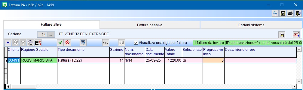 Procedere come per le altre fatture all'invio a SDI dal programma Fatture B2b (V 3-B). Il documento risulterà con tipo documento Fattura e verificare che la numerazione sia associata a una sezione (nell’esempio /14).