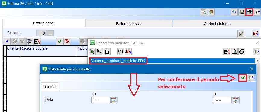 Si attiverà una sezione intervalli per definire il periodo di controllo delle notifiche, che non necessariamente deve essere lo stesso periodo selezionato entrando nel programma Fattura PA/b2b/2b2c (V 3-B).