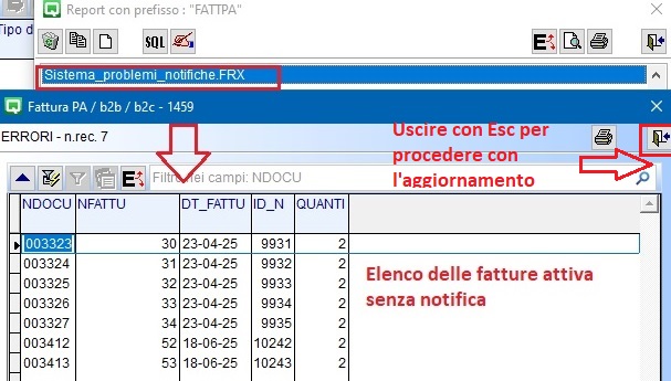 Al termine dell'elaborazione se non sono presenti delle notifiche di fatture eletroniche inviate e consegnate, il programma attiverà una videata mostrando l'elenco delle fatture senza notifica, diversamente mostrerà un messaggio "Non ci sono testae FATTBTB da correggere".